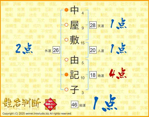 生活面を象徴する運勢です。外部から受ける影響力を表し、結婚運、家庭運や職場、環境への順応性を表します。総運から人運を引いた画数。姓や名が1文字の場合を除く。