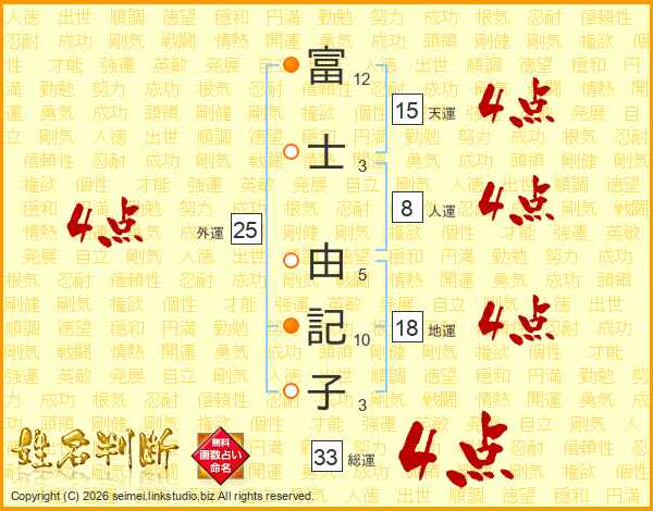 富(12画)士(3画) 由(5画)記(10画)子(3画)