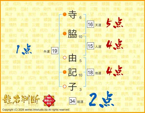 寺(6画)脇(10画) 由(5画)記(10画)子(3画)