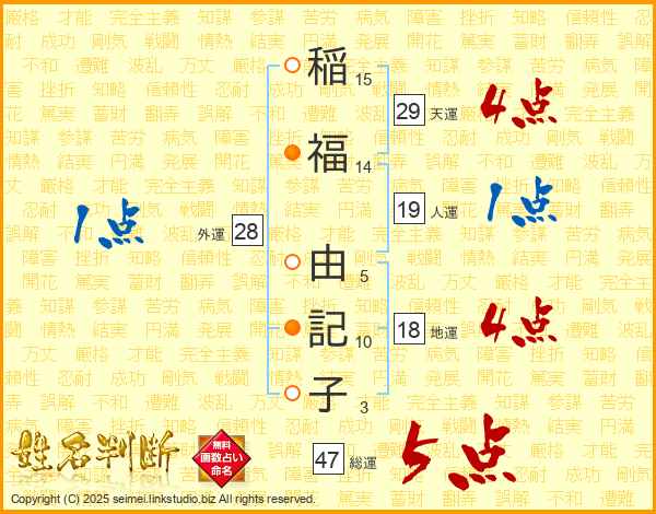 稲(15画)福(14画) 由(5画)記(10画)子(3画)