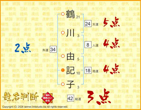 鶴(21画)川(3画) 由(5画)記(10画)子(3画)