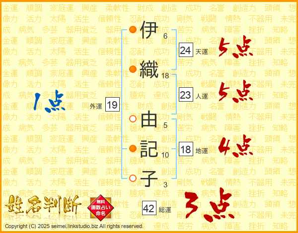 伊(6画)織(18画) 由(5画)記(10画)子(3画)