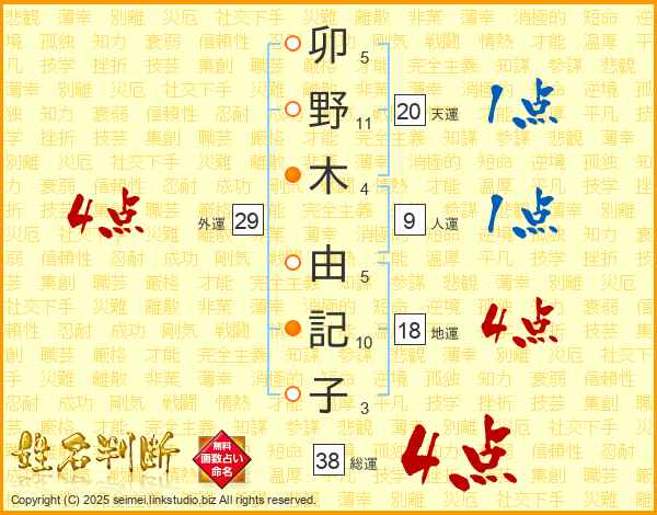 卯(5画)野(11画)木(4画) 由(5画)記(10画)子(3画)