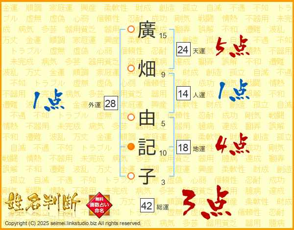 廣(15画)畑(9画) 由(5画)記(10画)子(3画)