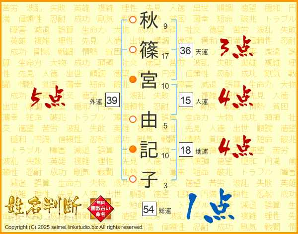 秋(9画)篠(17画)宮(10画) 由(5画)記(10画)子(3画)