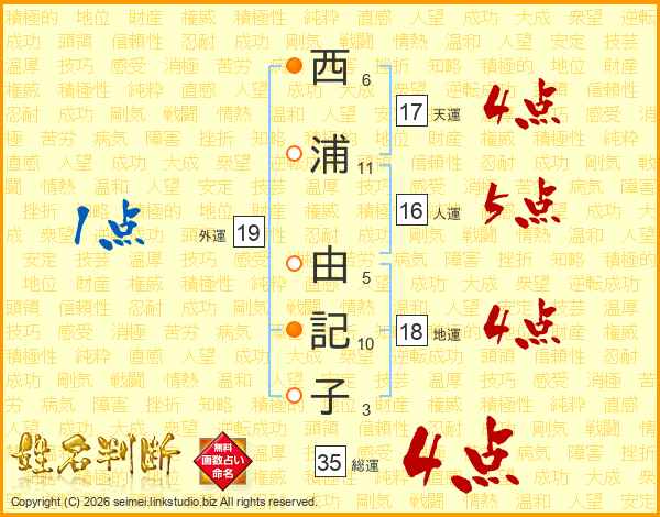 西(6画)浦(11画) 由(5画)記(10画)子(3画)