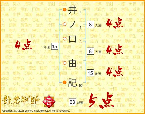 生活面を象徴する運勢です。外部から受ける影響力を表し、結婚運、家庭運や職場、環境への順応性を表します。総運から人運を引いた画数。姓や名が1文字の場合を除く。