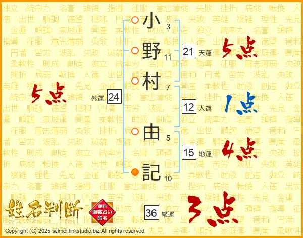 小(3画)野(11画)村(7画) 由(5画)記(10画)