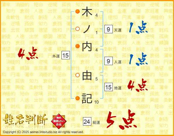 木(4画)ノ(1画)内(4画) 由(5画)記(10画)