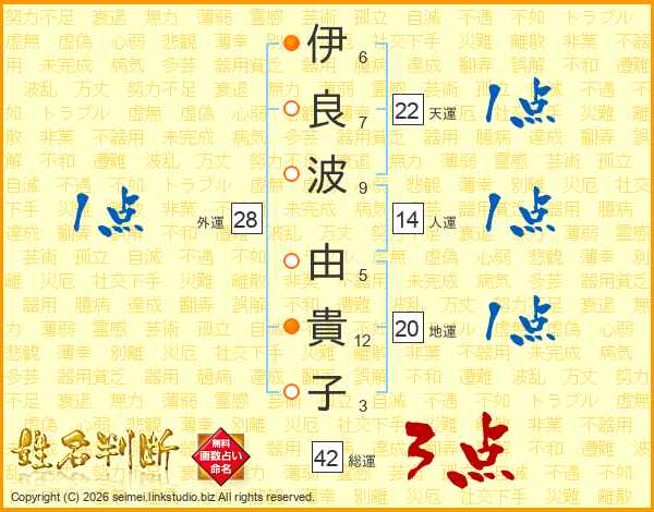 伊(6画)良(7画)波(9画) 由(5画)貴(12画)子(3画)