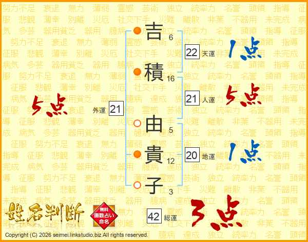 吉(6画)積(16画) 由(5画)貴(12画)子(3画)