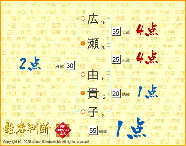 広瀬由貴子さんの人運は25画の4点
