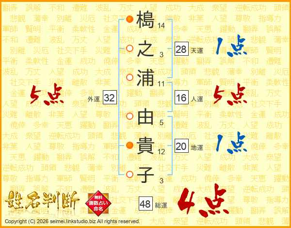槝(14画)之(3画)浦(11画) 由(5画)貴(12画)子(3画)