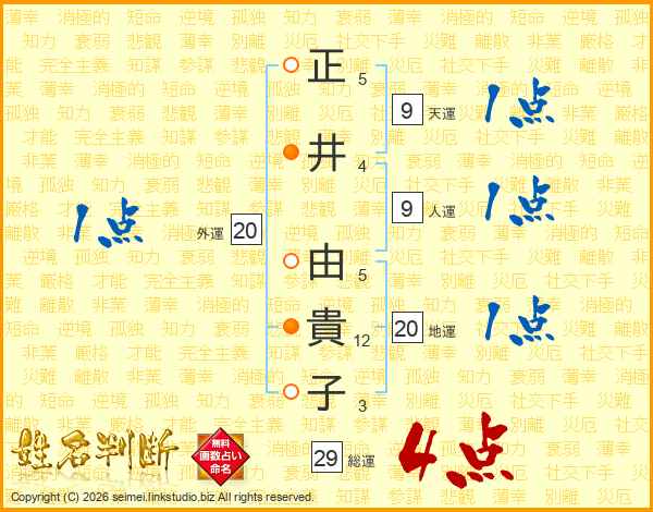正(5画)井(4画) 由(5画)貴(12画)子(3画)