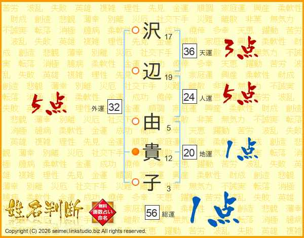 沢(17画)辺(19画) 由(5画)貴(12画)子(3画)