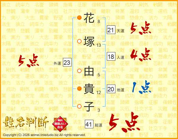 花(8画)塚(13画) 由(5画)貴(12画)子(3画)