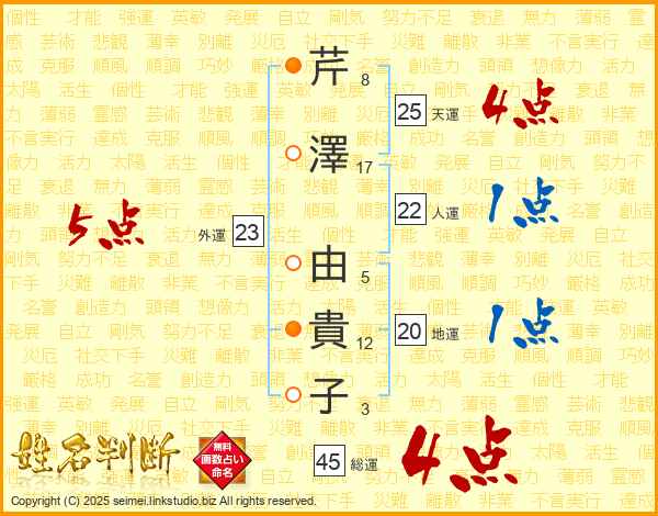 芹(8画)澤(17画) 由(5画)貴(12画)子(3画)