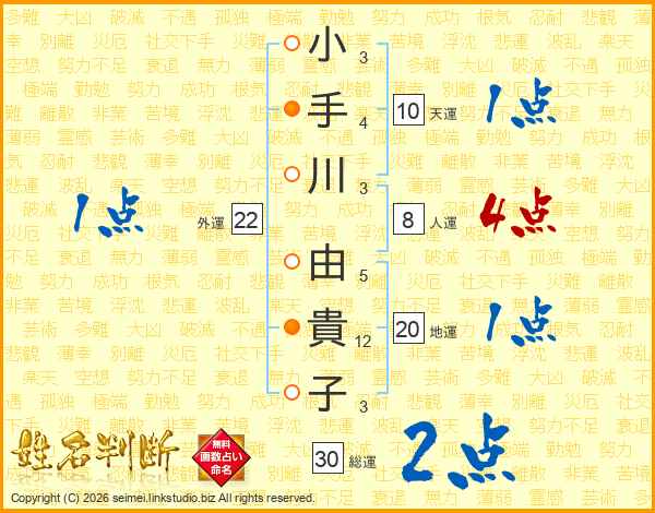 小手川由貴子さんの総運は30画の2点!
