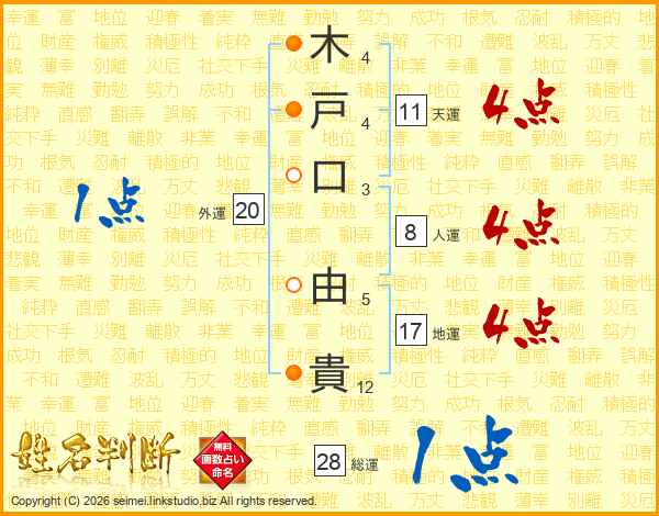 木(4画)戸(4画)口(3画) 由(5画)貴(12画)