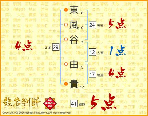 東(8画)風(9画)谷(7画) 由(5画)貴(12画)