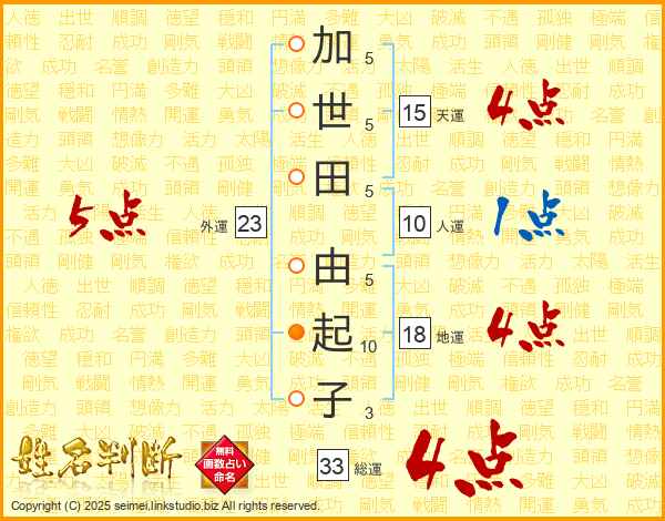 加(5画)世(5画)田(5画) 由(5画)起(10画)子(3画)