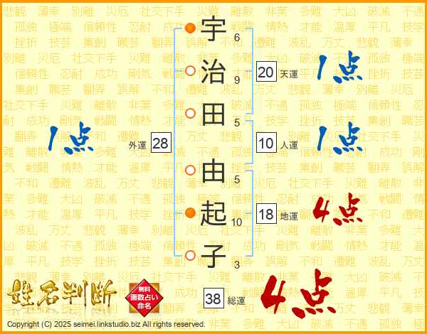 宇(6画)治(9画)田(5画) 由(5画)起(10画)子(3画)
