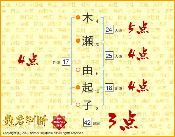 木(4画)瀬(20画) 由(5画)起(10画)子(3画)
