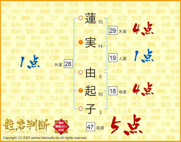 蓮(15画)実(14画) 由(5画)起(10画)子(3画)
