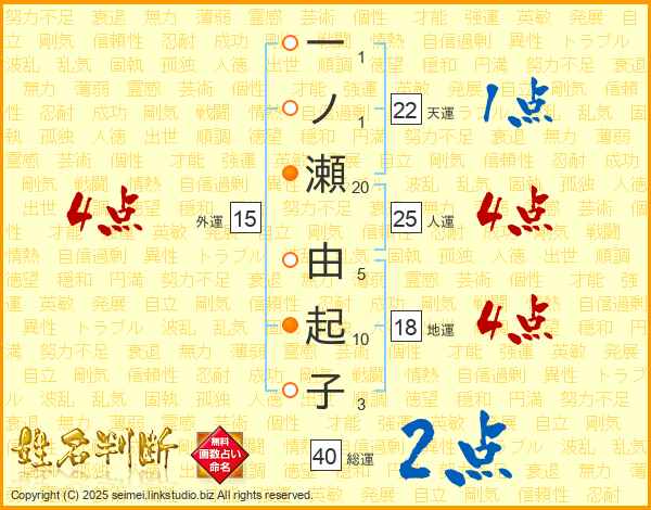 一(1画)ノ(1画)瀬(20画)  由(5画)起(10画)子(3画)