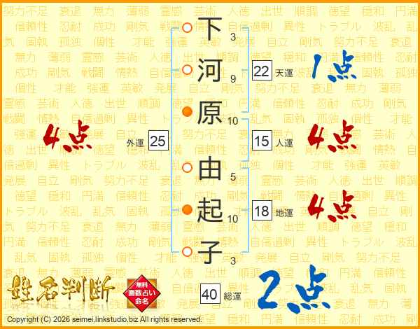 生活面を象徴する運勢です。外部から受ける影響力を表し、結婚運、家庭運や職場、環境への順応性を表します。総運から人運を引いた画数。姓や名が1文字の場合を除く。