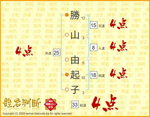 勝(12画)山(3画) 由(5画)起(10画)子(3画)