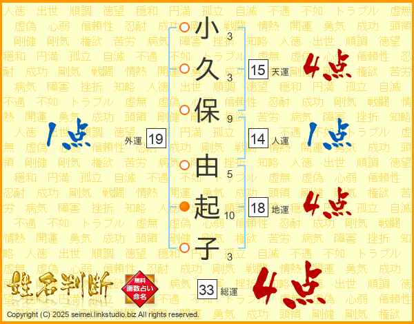 生活面を象徴する運勢です。外部から受ける影響力を表し、結婚運、家庭運や職場、環境への順応性を表します。総運から人運を引いた画数。姓や名が1文字の場合を除く。