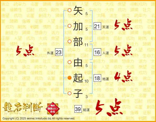 生活面を象徴する運勢です。外部から受ける影響力を表し、結婚運、家庭運や職場、環境への順応性を表します。総運から人運を引いた画数。姓や名が1文字の場合を除く。