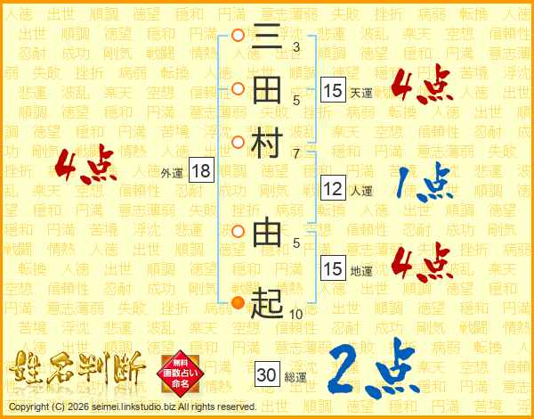 三(3画)田(5画)村(7画) 由(5画)起(10画)