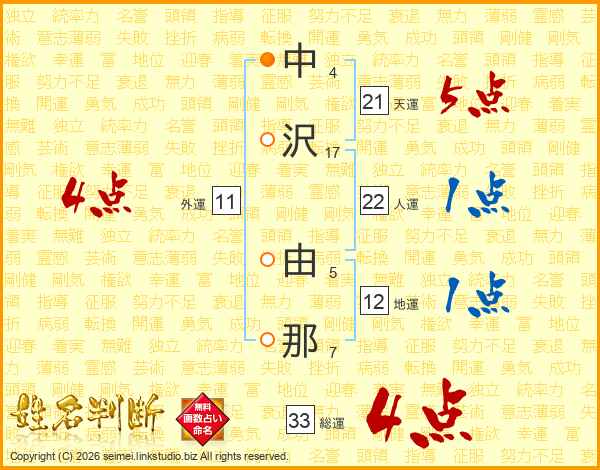 中沢由那さんの総運は33画の4点!