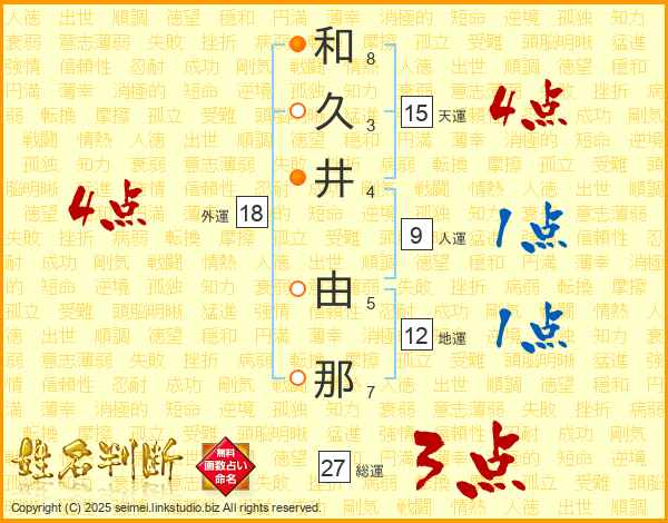 和(8画)久(3画)井(4画) 由(5画)那(7画)