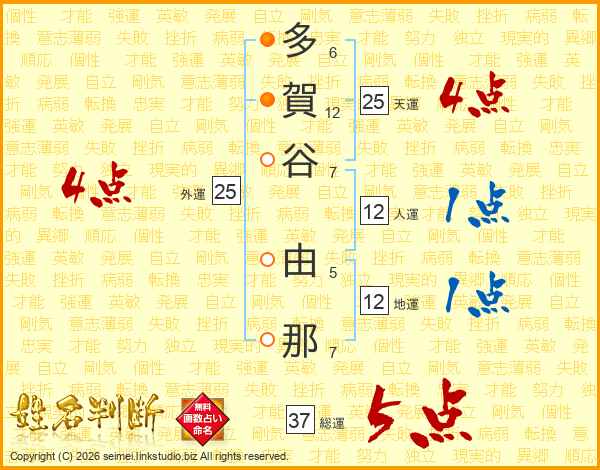 多(6画)賀(12画)谷(7画) 由(5画)那(7画)