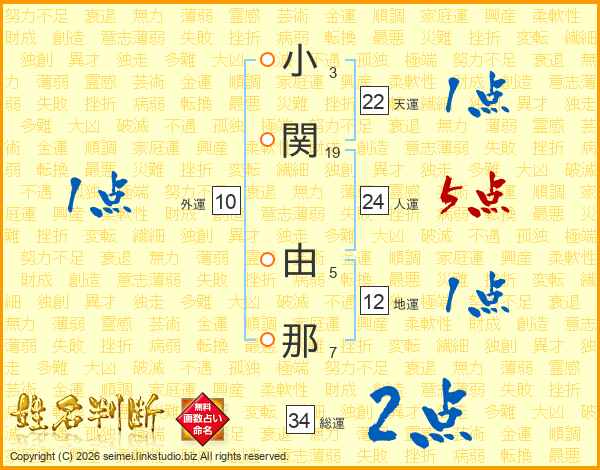 生活面を象徴する運勢です。外部から受ける影響力を表し、結婚運、家庭運や職場、環境への順応性を表します。総運から人運を引いた画数。姓や名が1文字の場合を除く。