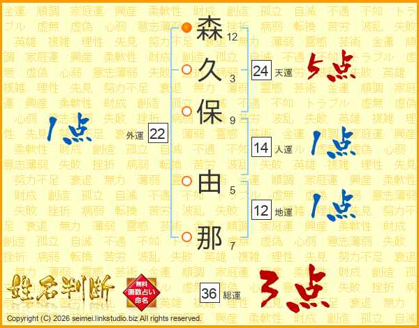 森(12画)久(3画)保(9画) 由(5画)那(7画)