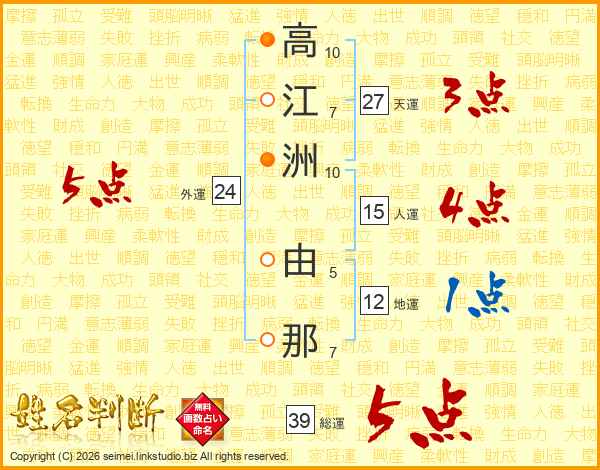 高(10画)江(7画)洲(10画) 由(5画)那(7画)