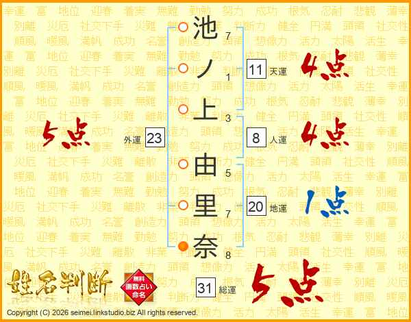 池(7画)ノ(1画)上(3画) 由(5画)里(7画)奈(8画)
