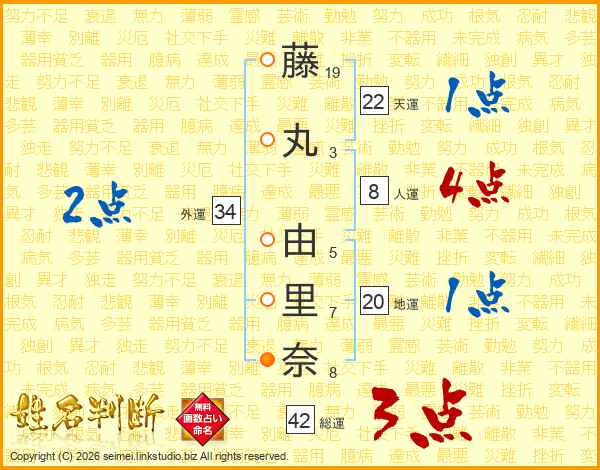 藤(19画)丸(3画) 由(5画)里(7画)奈(8画)