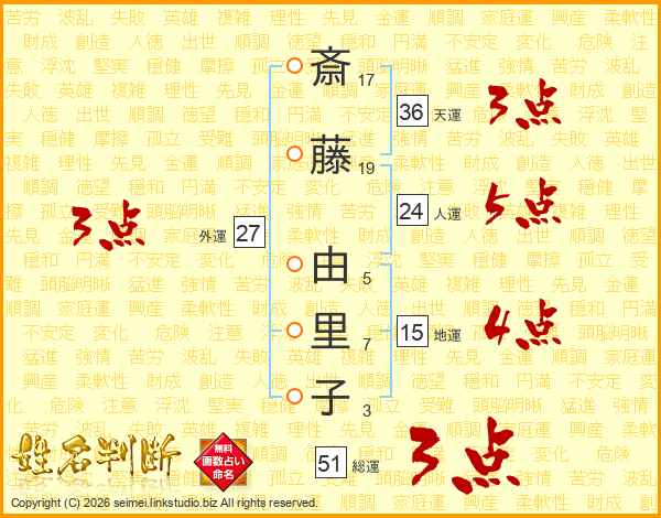 斎(17画)藤(19画) 由(5画)里(7画)子(3画)