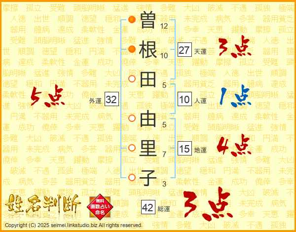 曽(12画)根(10画)田(5画) 由(5画)里(7画)子(3画)