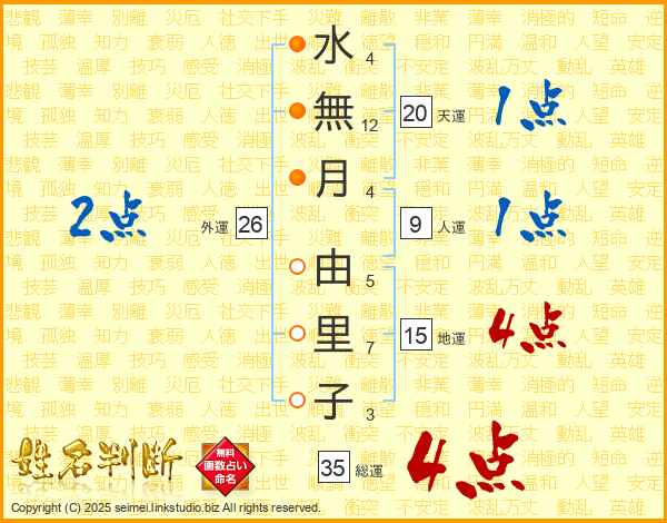 水(4画)無(12画)月(4画) 由(5画)里(7画)子(3画)