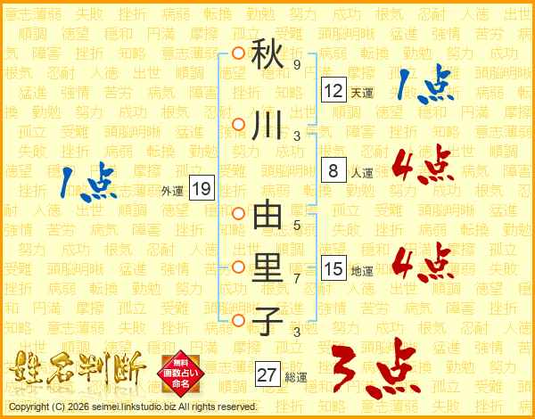 秋(9画)川(3画) 由(5画)里(7画)子(3画)