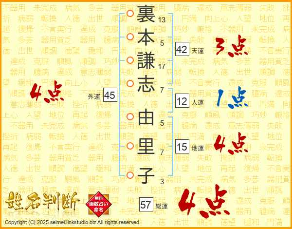 裏本謙志由里子さんの総運は57画の4点!