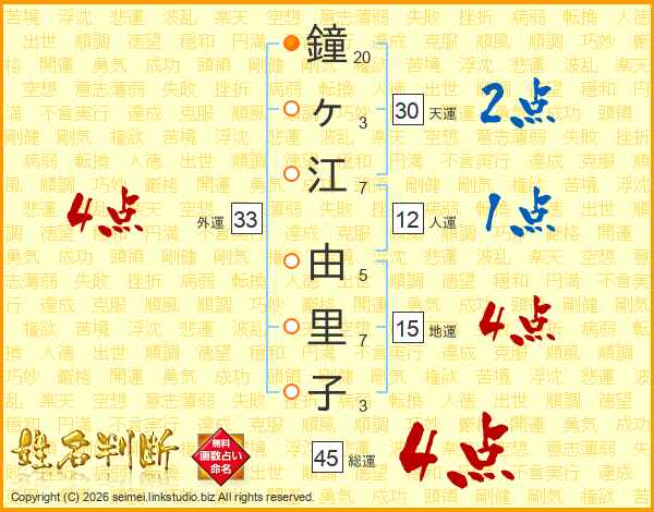 鐘(20画)ヶ(3画)江(7画) 由(5画)里(7画)子(3画)