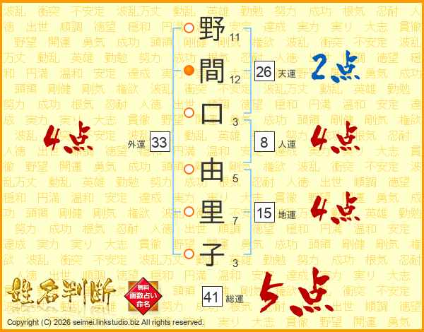 野(11画)間(12画)口(3画) 由(5画)里(7画)子(3画)
