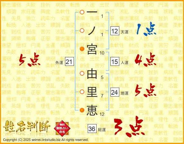 一(1画)ノ(1画)宮(10画) 由(5画)里(7画)恵(12画)
